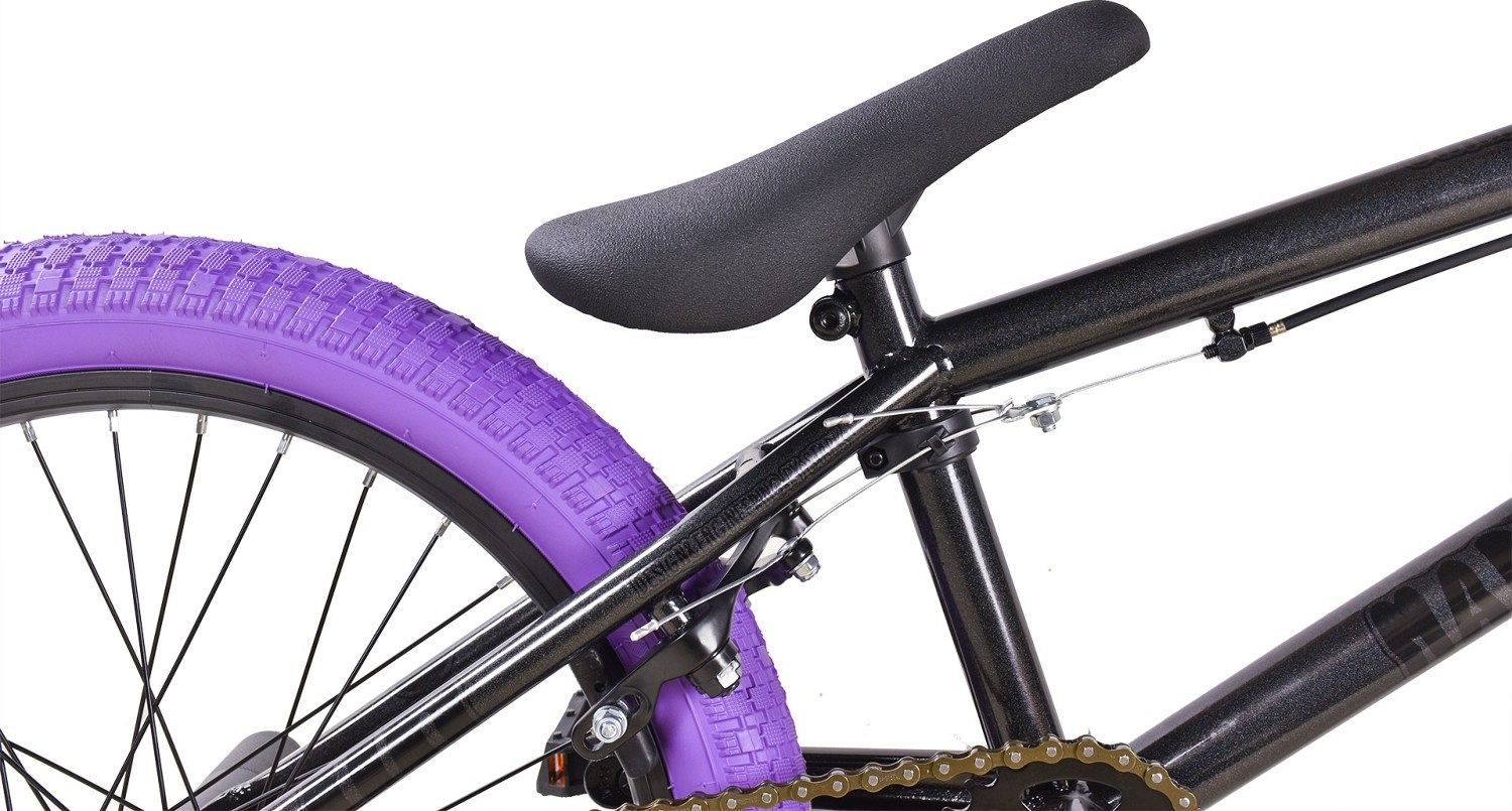 Седло Aerj A-6609 создает комфорт во время катания, а педали Feimin FP850P предлагают надежное сцепление с обувью, что важно для выполнения трюков. Велосипед также оснащен пегами – одной передней и одной задней, безрезьбовыми, что расширяет возможности для выполнения различных трюков.