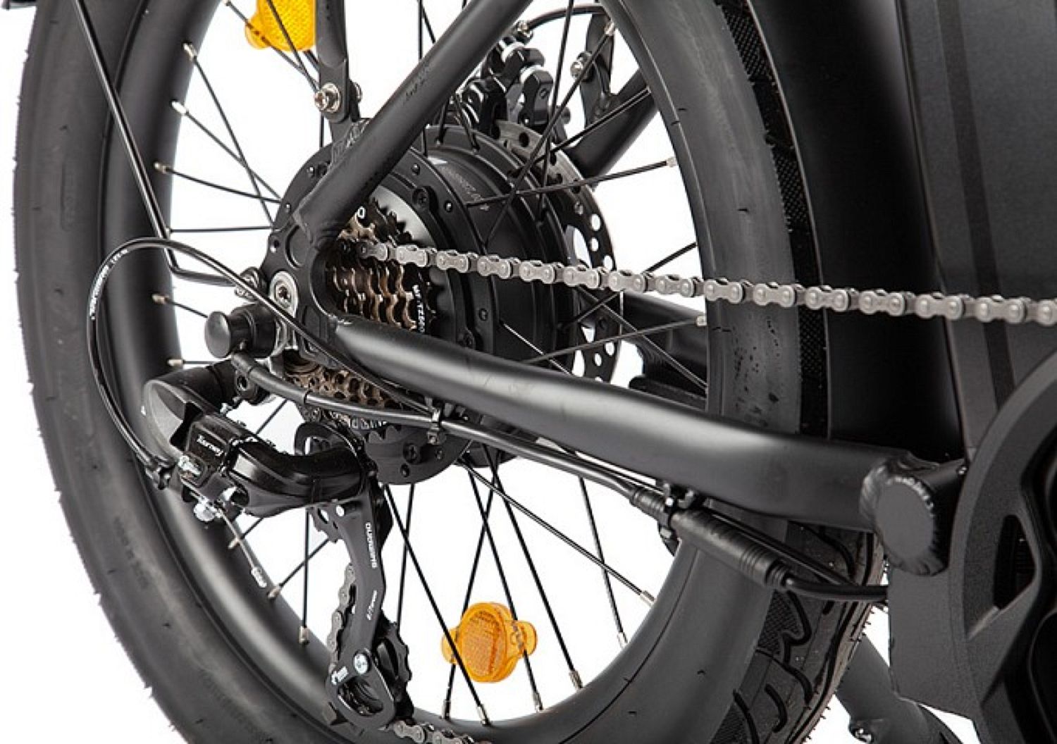 Модель оснащена легкой складной алюминиевой рамой и широкими колесами 20" х 3,00", что обеспечивает отличную проходимость на сложных участках. Мощный электромотор мощностью 500 ватт и съемный аккумулятор емкостью 48 вольт / 13 Ач позволяют проехать до 50 километров без подзарядки.