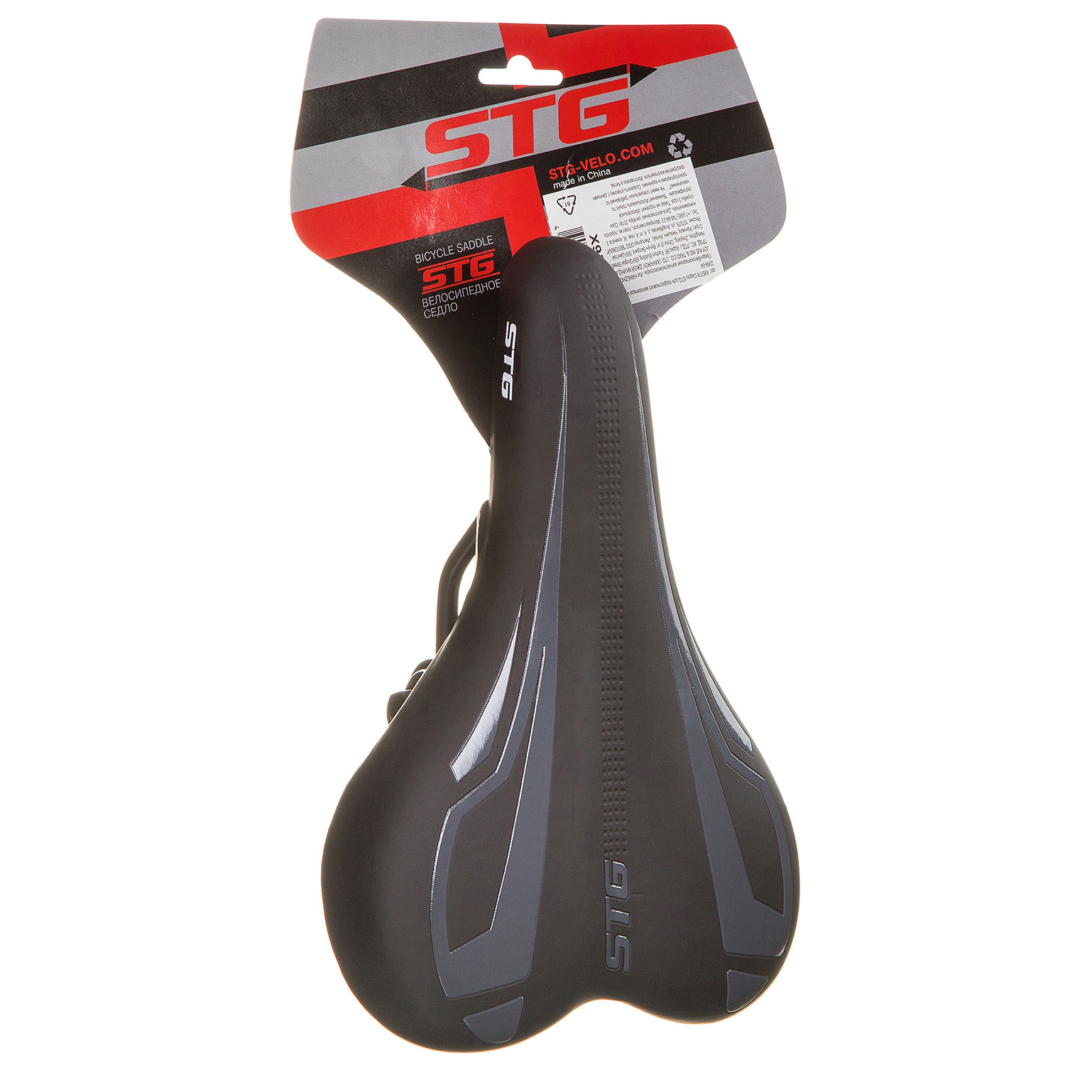 Комфортное седло STG-2368-04 верхняя часть которого выполнена из искусственной кожи, низ - из пластика. Настроить положения седла можно с помощью стальных рамок.