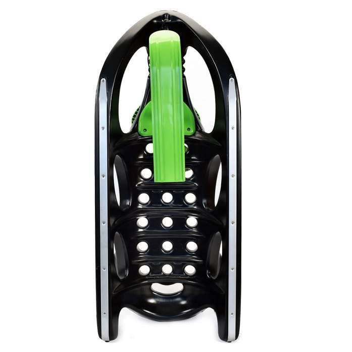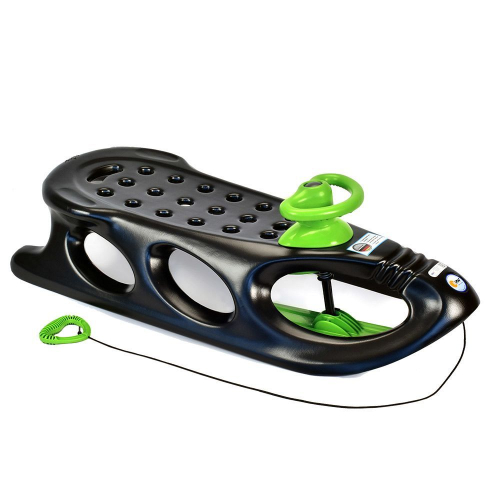 Управляются рулем. Снизу расположенны металлические полозья, которые улучшают скольжение и защищают санки от повреждений.