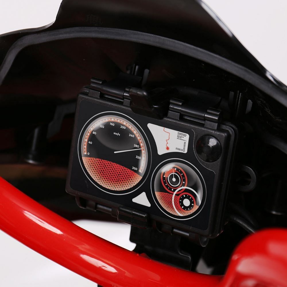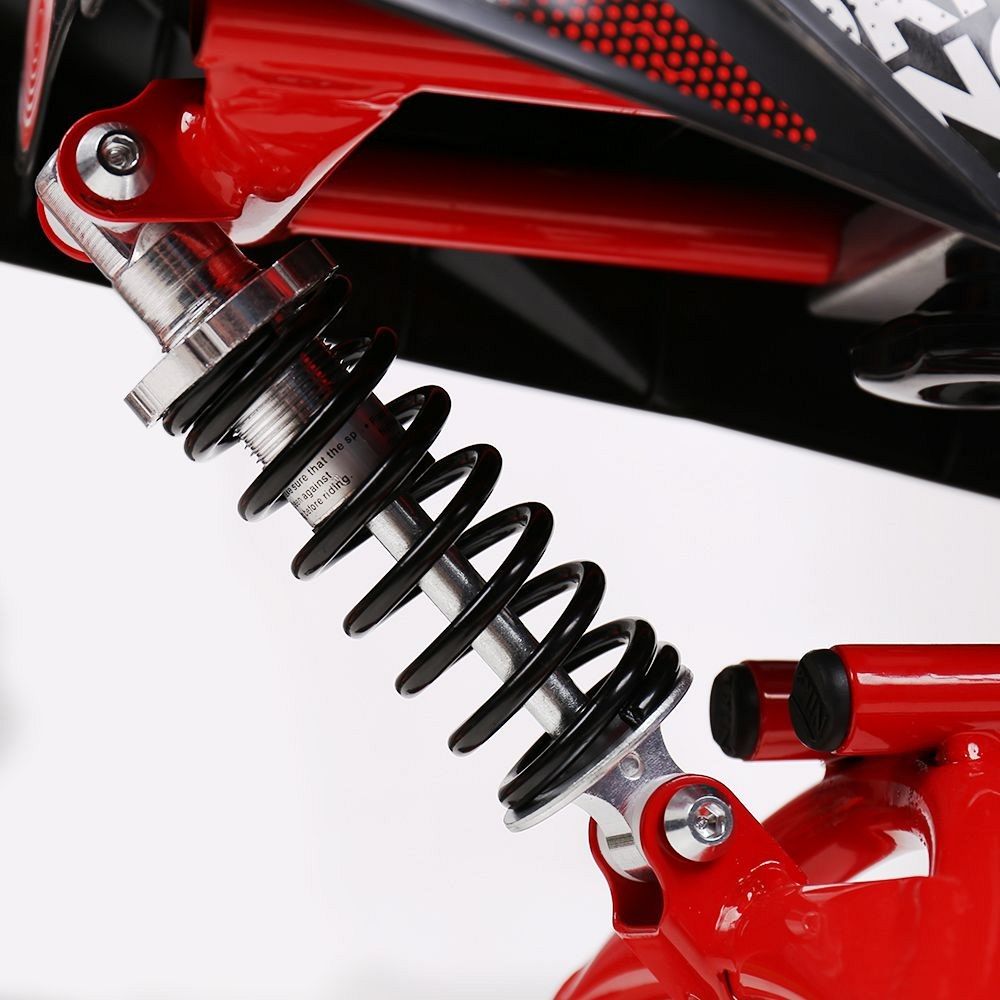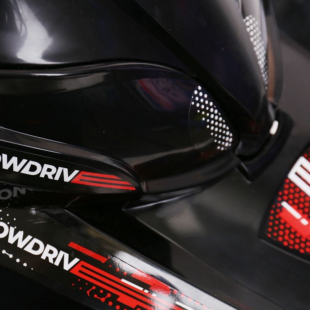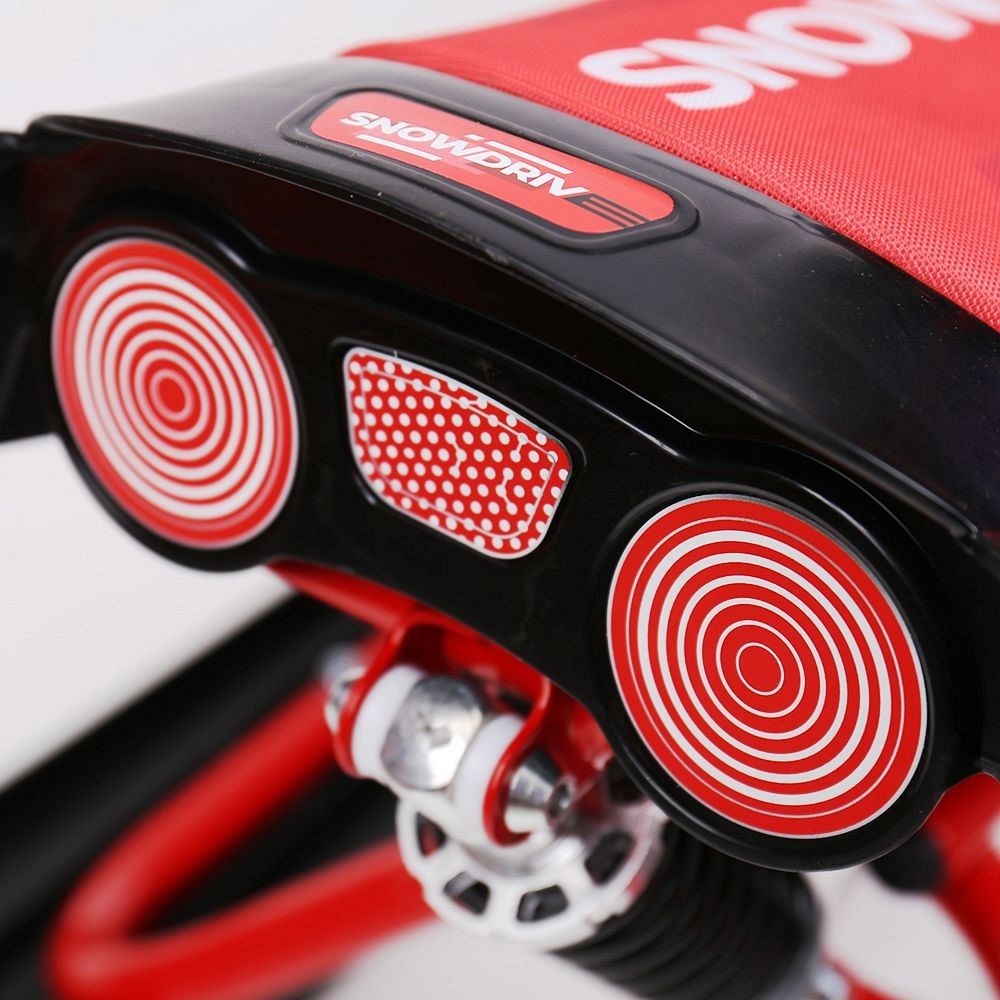 Снегокат оснащён велорулём с защитой для рук, который обеспечивает лёгкость управления и добавляет элемент спортивного стиля. Система амортизации делает катание более плавным и комфортным, смягчая удары и вибрации при движении по неровной поверхности. Светодиодные лампочки в передних фарах не только придают снегокату современный вид, но и повышают видимость в тёмное время суток, что добавляет дополнительный уровень безопасности.