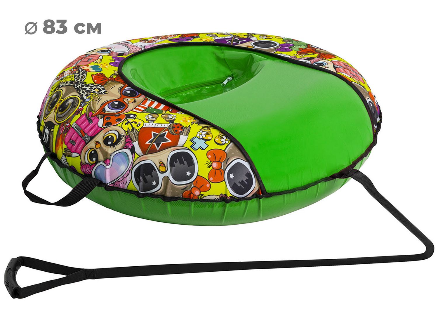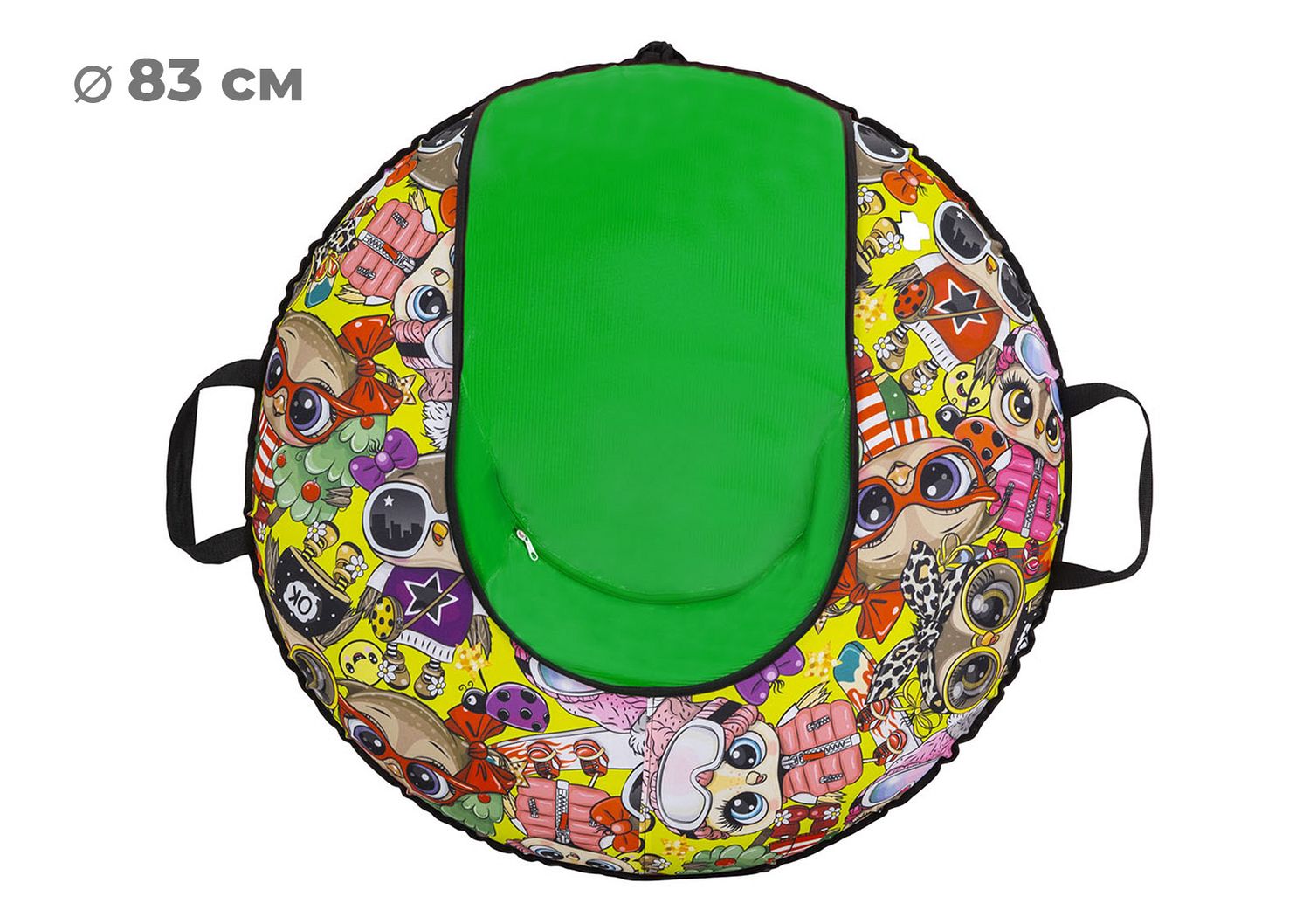 Размер тюбинга составляет 83 см, этот размер позволяет кататься на нём детям ростом до 110 см. Данный тюбинг выдерживает вес до 50 кг